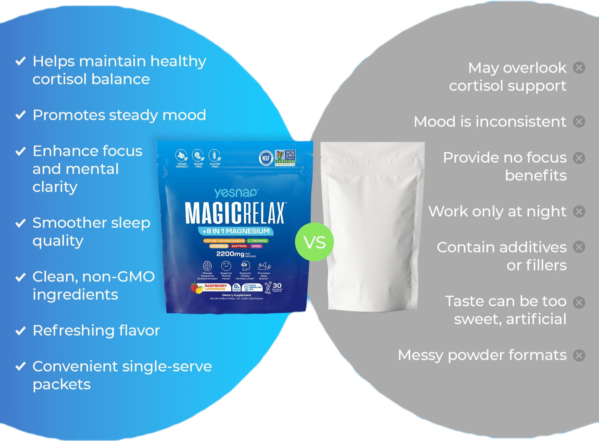 It offers balanced wellness (supports sleep, stress, mood, and focus), uses highly bioavailable 8-in-1 Magnesium (gentle on digestion), is NSF-verified, and contains clean ingredients (gluten-free, no artificial flavors/colors, non-GMO). It also comes in convenient single-serve packets, unlike messy powder formats of competitors.